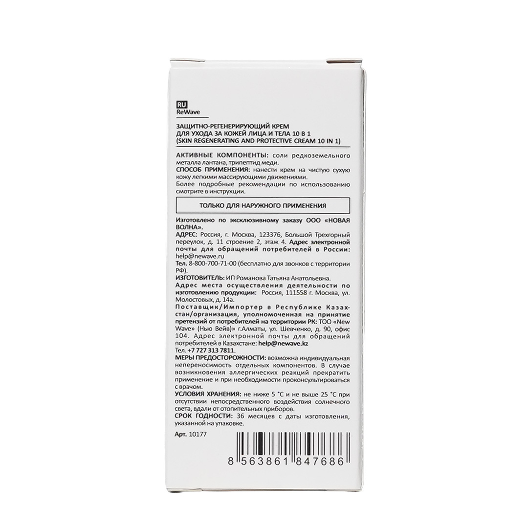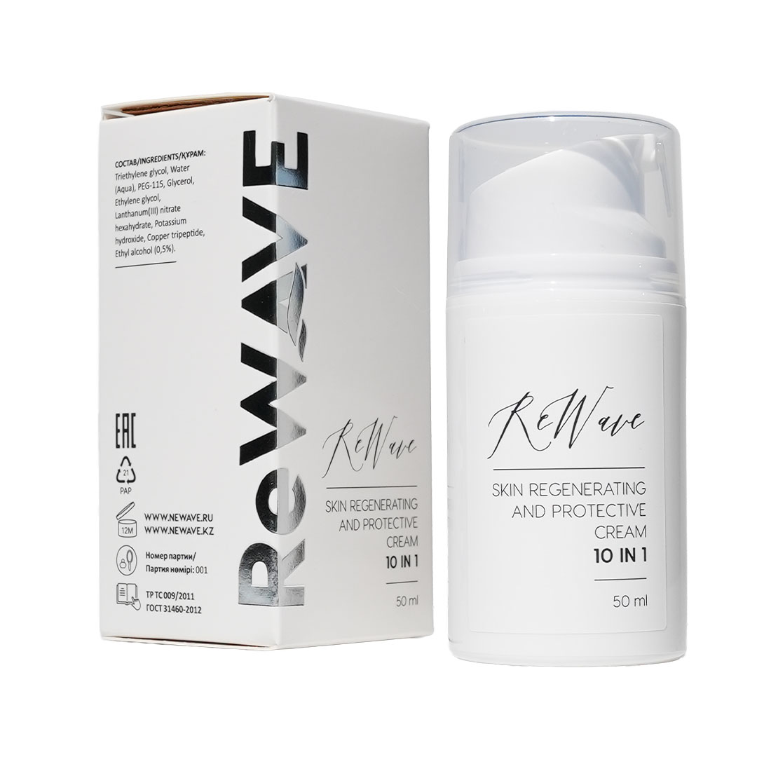 Совокупность многонаправленных свойств металлов ЛАНТАНА и МЕДИ, позволило NEW WAVE представить потрясающий косметический продукт с уникальными свойствами, который способен заменить сразу до 10 косметических средств — Защитно-регенерирующий крем ReWave для ухода за кожей лица и тела 10 в 1.